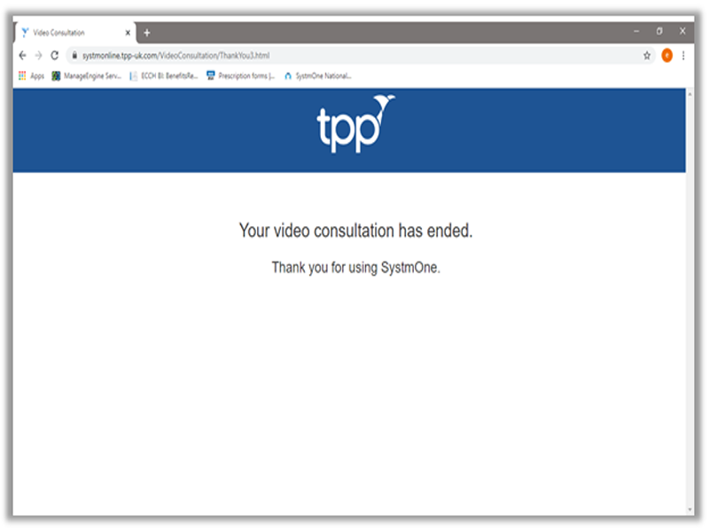 Once pressed, your browser will display the words: “your video consultation has ended”. Please close the browser to conclude the session.